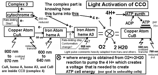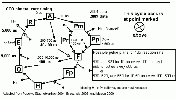 Idealmente, sería mejor hacer una * secuencia * de pulsos ligeros de < 10 microsegundos de diferentes longitudes de onda en lugar de todas las longitudes de onda a la vez. Por ejemplo, un pulso de nm 660 seguido de 620 nm y 830 nm. Esto podría convencer a una reacción en la etapa del extremo (en el "núcleo bimetálico" con 660 nm, ver más abajo), para crear una "ranura abierta" (tirón electrostático) de un electrón desde el átomo del metal "anterior" (heme A) para que la longitud de onda próxima puede ser mejor utilizado para activar (620 nm). El pulso a 850 nm sería crear una ranura abierta (tirón electrostático) para que la limitación de velocidad citocromo c insertar el siguiente electrón en CCO. ((Por cierto, esto puede causar un tirón electrostático que transmite el respaldo de la cadena de transporte de electrones todo a los otros complejos que independientemente se transfieren H + 4 otro por ciclo CCO. Esto puede prevenir electrones de "escaparse" y de tal modo que causan los radicales libres y posiblemente permitir más eficiente "incinerador de grasa"... Si alguien ejerciendo al mismo tiempo. )) Los tiempos para cada pulso y fuera de tiempo es muy complicado ya que hay todavía muchas incógnitas en la actividad de la CCO. El mejor tiempo entre los 670 nm y el 620 nm será difícil de determinar, pero 620 puede ser simultánea con 850. Puede llegar a ser mejor aplicar los tres al mismo tiempo porque el artículo de 2009 que a continuación dice el heme un a3 paso tarifa-limitador puede coincidir con una c de cyt a paso de limitación de la velocidad de CuB.