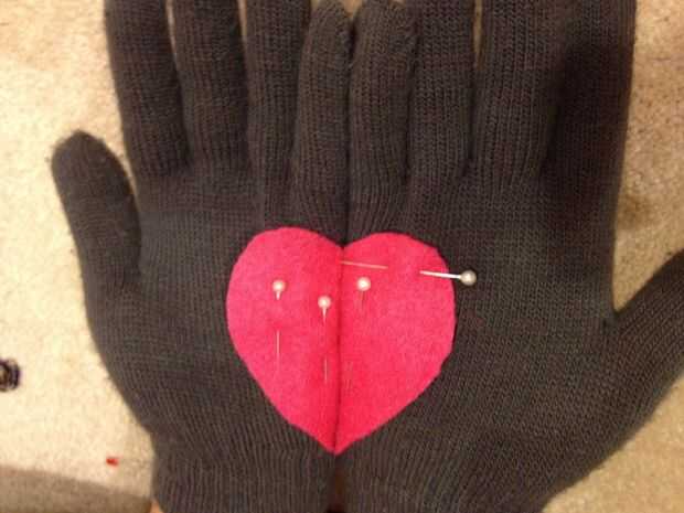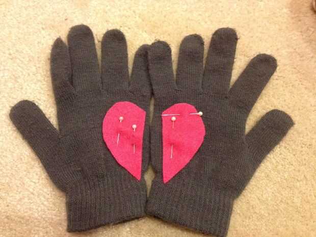 Posición y pin abajo las piezas de corazón en los guantes más lejos lejos de los pulgares. Los bordes donde se corta el corazón deben ser uno frente al otro. No pin les directamente en el borde de los guantes porque cuando pones las manos en los guantes ampliará y la mitad de su corazón desaparecerá.