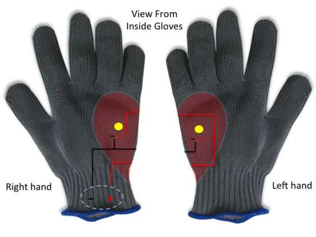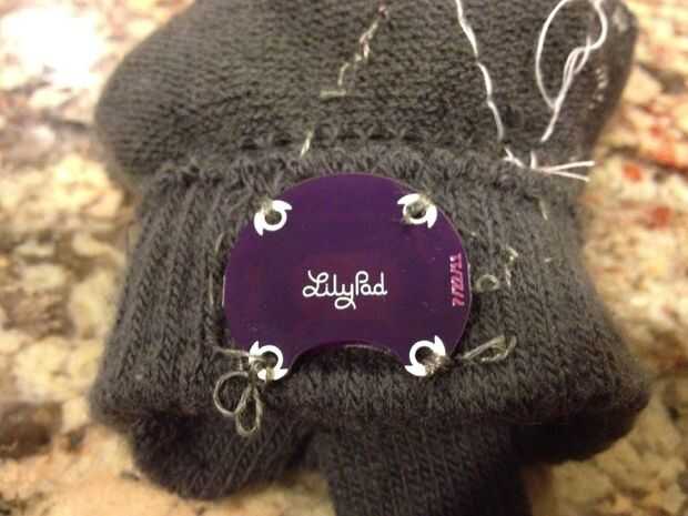 Me pareció más fácil de coser con el guante de revés. Así también incluye un esquema de cómo el circuito debe ser cosido en desde el interior. Los guantes que usé tenían suficientes puntos para mí poder coser en el hilo y no lo demuestran para arriba en el lado opuesto. Si usted puede hacer esto, hará que para una mirada agradable, limpia en sus guantes. El truco es no meter demasiado la aguja en el.