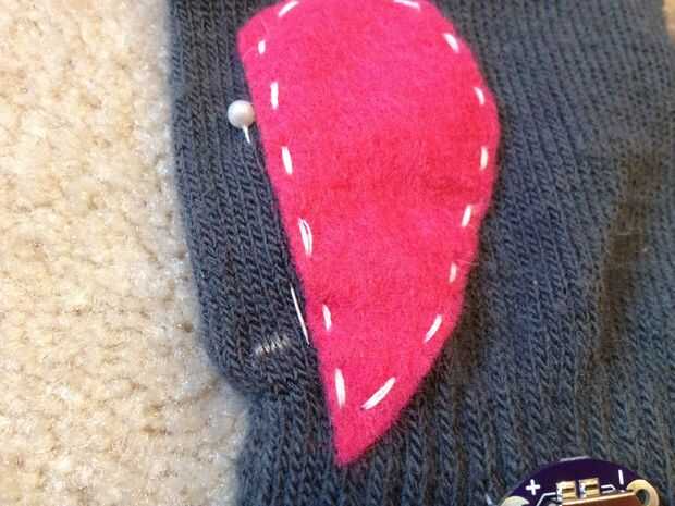 Una vez en el borde, debe ser capaz de ver el pasador colocado para indicar el punto de contacto con las manos. Esta parte puede conseguir difícil. Coser el hilo en líneas de 1cm alrededor del perno. Esto asegurará que es coser el hilo donde se encuentra su punto de contacto en las manos. Cosa estas líneas varias veces. Cuando termine de hacer esto, usted debe han formado a una especie de rectángulo con el hilo. Ver las imágenes como referencia.