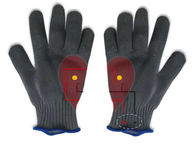Voltear el guante para la mano derecha de adentro hacia fuera y coser el portapilas. Asegúrese de que el lado positivo y negativo se corresponde con el esquema.