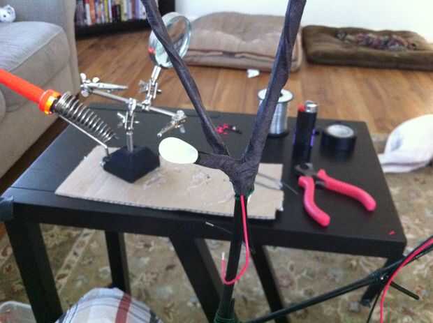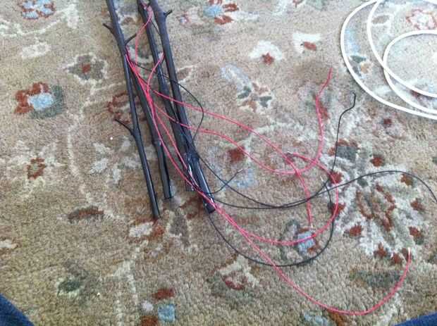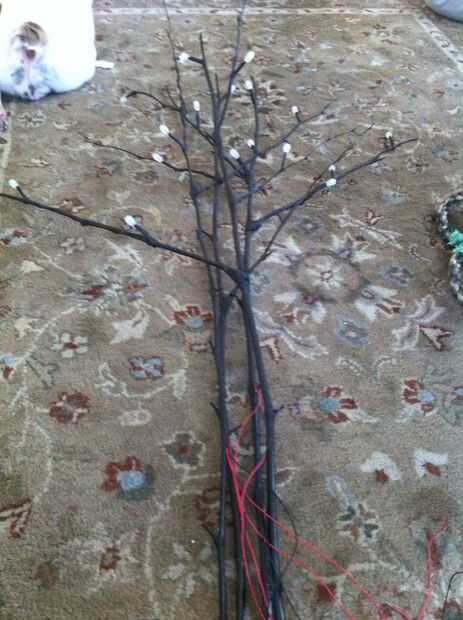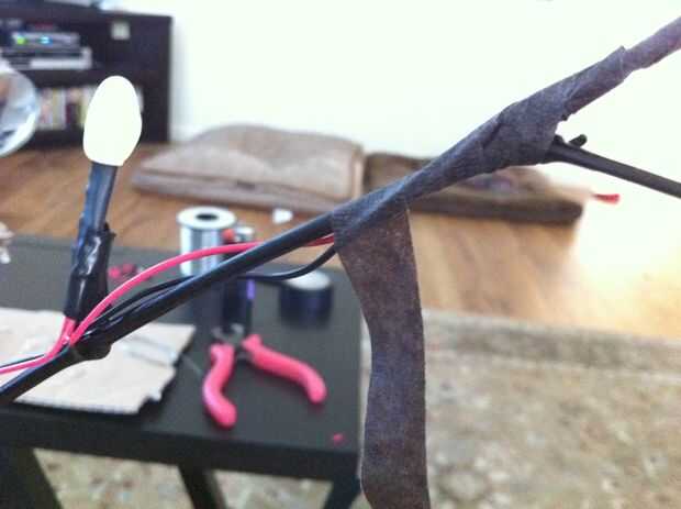 Cinta de LED en lugar de temperarly con cinta aislante. Puede dejar que los cables sólo colgar allí. Ahora agarra tu cinta de tallo Floral, comienza enrollándola alrededor de la rama en la base de los LED Dónde está el abrigo del encogimiento. Asegúrese de que es agradable y apretado, entonces comience envolviendo la rama entera cubriendo totalmente los cables (no quieres ver cualquier rojo o negro cables fuera enarbolar, no es realmente algo ve en la naturaleza). Envuelva cada rama viene de la rama principal, luego empezar a envolver el rama principal de la parte superior hasta abajo. Si hay partes que necesitan más cinta sólo cortan un rollo y envuelven ontop derecha para cubrir errores ni grandes protuberancias que quiere hacer desaparecer!