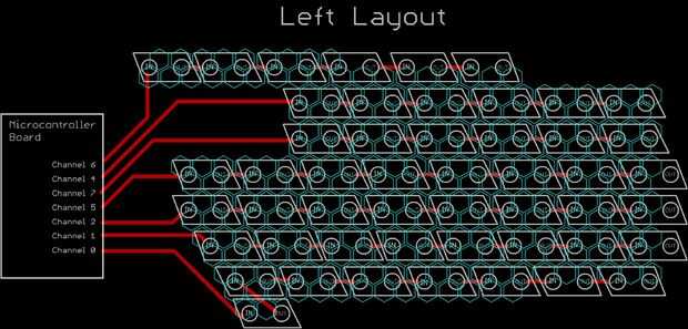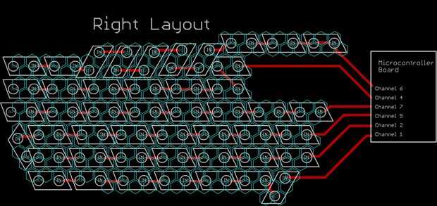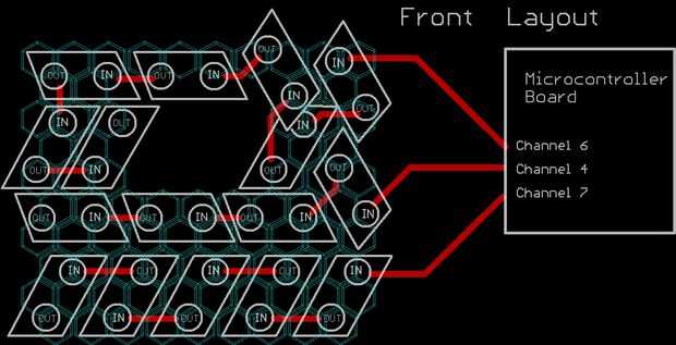 Este proyecto implica la asignación de posición de LED: los microcontroladores necesitan conocer la posición física de cada clúster RGB por lo que pueden hacer los patrones como el texto que se desplaza. El programa que se instala en unos pocos pasos tiene un archivo que contiene las posiciones de cada grupo de LED en mi cesta. Necesita para que coincida con mi posición y cableado de los tableros si desea que este archivo sea correcta. He conectado tres diagramas que muestran cómo los tableros de LED están conectados y colocados y en cada uno de los tres lados. Derecha e izquierda son desde la perspectiva de una persona en la bicicleta. Los esquemas muestran las posiciones de los tableros de LED como se ve desde el interior (lado de silicona las juntas a).