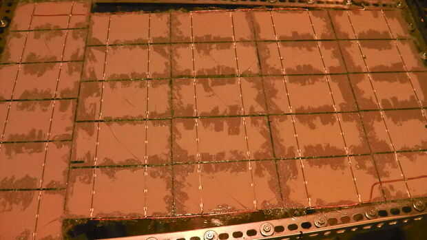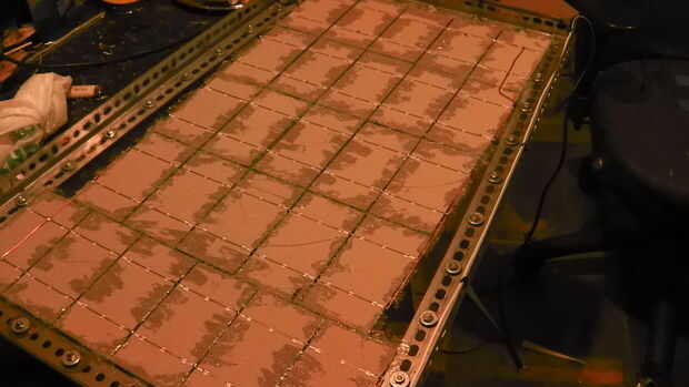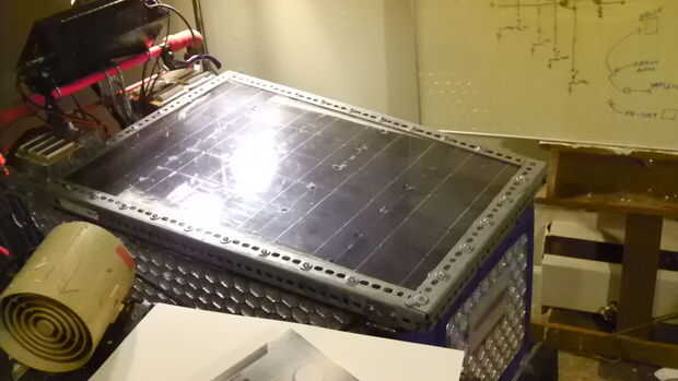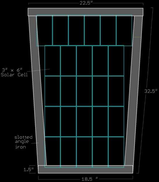El panel consta de 26 Evergreen eléctrica 0, 5V 1A 3 "x 6" células solares monocristalinas conectadas en serie y al acrílico con silicona. Esto produce 1A 13v en un día soleado que cumple los requisitos del controlador de carga solar.