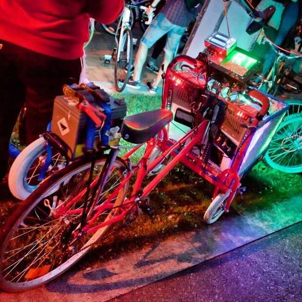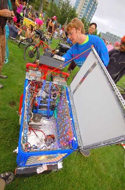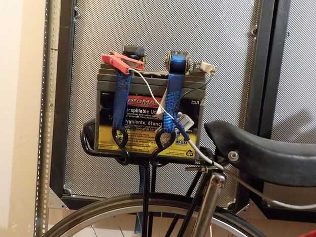El grande de la batería es una batería de ciclo profundo 100Ah para RVs y barcos. Puede mantener las luces y la música durante casi diez horas pero pesa 58 kg. Puedo montar con él instalado, pero tengo que bajar y empujar a levantarse incluso una leve inclinación. Esta batería va dentro de la canasta y se sostiene en lugar con dos tirantes.