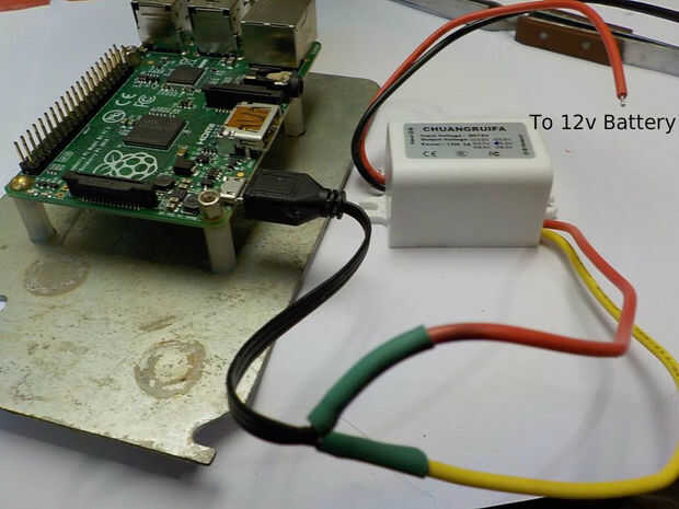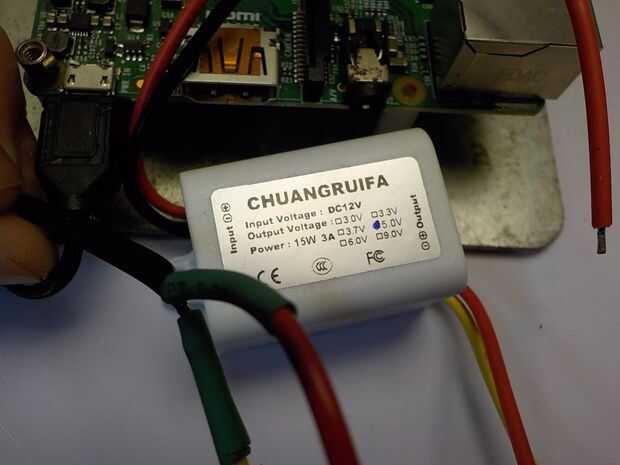 No quiero la frambuesa Pi compartir uno de los tres reguladores usados por el microcontrolador y llevado juntas, así que dio uno de los suyos. Se trata de un regulador de conmutación de 3A en lugar de 10A porque la frambuesa Pi no necesita tanta corriente. Si utilizas un Pi de frambuesa 2 puertos mayores puede usar este mismo regulador a un concentrador USB. El regulador se conecta con el rojo y negro los cables en el cable de alimentación USB.