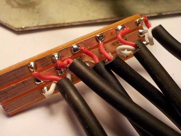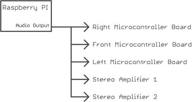La salida de audio debe ser dividido cinco veces porque va a los tres tableros de microcontrolador y los dos amplificadores estéreos. No es necesario un divisor de potencia. Pude haber comprado un 1 -> 5 divisor audio pero soldar uno desde cero era más rápido que ir a la tienda.
