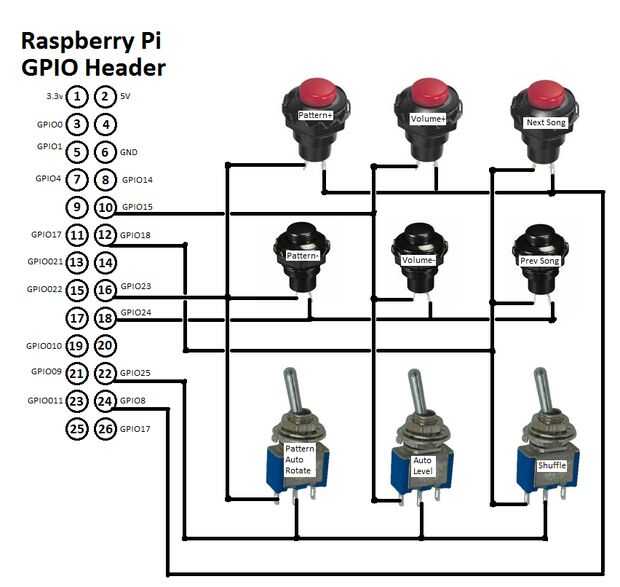 La matriz de botón permite a un usuario seleccionar canciones, controlar el volumen y cambiar los patrones de iluminación. El script de Python en el paso 30 ya está configurado para utilizar. Los botones de conectan a los pines GPIO de frambuesa Pi a través de una matriz de interruptor porque esto permite 9 botones ocupar sólo seis pernos.