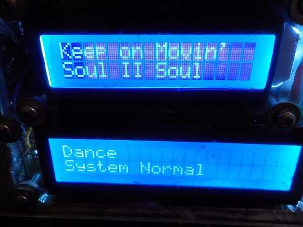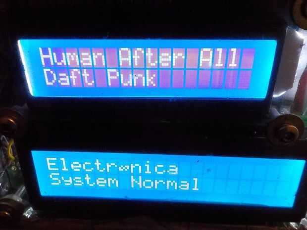 El script de Python de paso 30 está configurado para cuatro líneas de texto a un par de pantallas LCD de caracteres de salida. Los LCDs son controlados a través del puerto GPIO de la Raspberry PI. La información muestra en cada línea es: nombre del álbum, nombre del músico, género musical y estado del sistema de PI de frambuesa. Información de la canción se extrae de las etiquetas ID3.
