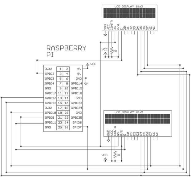 Adafruit proporciona una muy buena python HD44780 biblioteca pero yo quería ejecutar dos LCDs en paralelo. Esto significaba hacer algunas modificaciones menores a la biblioteca de adafruit. Los datos y los cables RS de las dos pantallas de LCD están conectados juntos. Obtener los mismos datos tanto restablecer las señales, pero sus patillas enable (E) son salidas GPIO conectados a independiente por lo que sólo acepta una señal entrante en un momento.