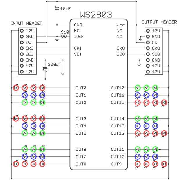 LEDs son conducidos por fichas de WS2803. Éstos tienen dieciocho canales de salida de 30v, control PWM de 8 bits, drivers de corriente y pueden ser encadenados junto como registros de desplazamiento SPI.