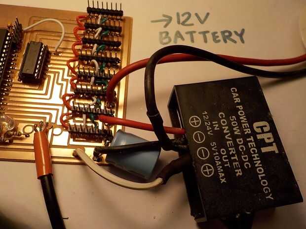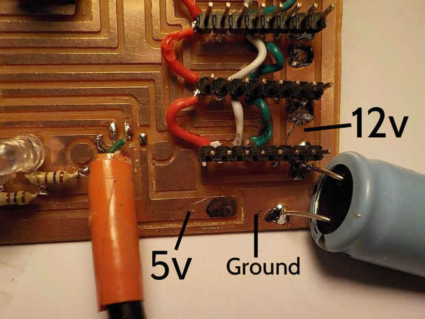Los tableros de microcontrolador tienen entradas de 12v y 5v. 12V no es utilizado por alguno de los componentes en la placa del microcontrolador, pero se envía a los tableros de LED a través de los canales de salida. Un 12v -> 5v regulador debe ir entre las secciones de 12v y 5v. Esto produce 5v para funcionar el microcontrolador y lógica de WS2803 de una batería de 12v.