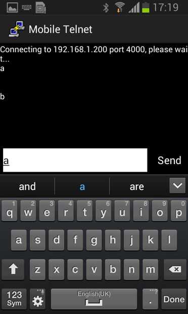 - La aplicación no te dice que está conectado pero si no ves "No se pudo conectar..." después de algunos segundos, intento enviar el carácter "a", si el telnet está conectado correctamente, el LED va encender mientras que envía a "b" la desactivará.