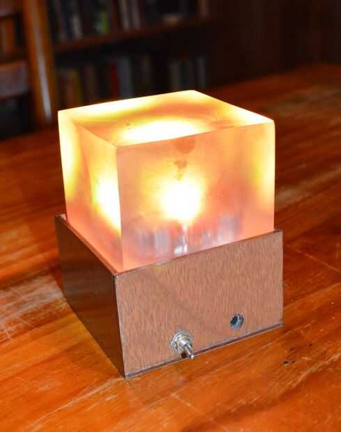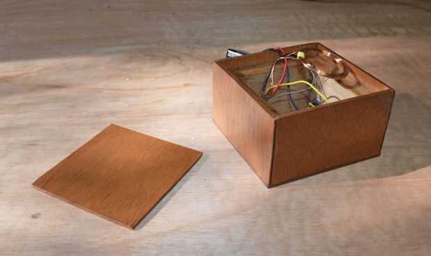 3. una vez seco necesita un par de agujeros de taladro en la tapa. Esto es donde pasarán los cables de la bobina. La soldadura de la bobina de la caja amarilla a que se une y a través de los agujeros en la tapa. Volver a soldar y pegamento caliente la caja amarilla al lado de la caja de madera.