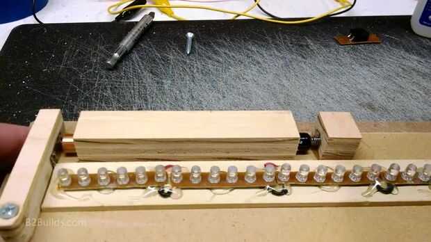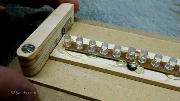 La tira de LED fue pegada en el centro del panel. Para instalar las pilas, corté un trozo de madera con una pequeña ranura para encajar una pila de tres pilas AAA. Por cierto, actualización a pilas marca de fábrica hecha las luces mucho más brillante.