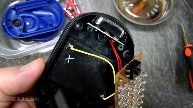 En primer lugar, encontrar el cable que se conecta a un conector positivo en el compartimento de la batería. Esta es la línea de energía positiva. Rastrear este cable a la placa de circuito y usar un marcador para identificar el rastro en el tablero. Una vez que haya identificado este punto, usted puede cortar los cables para desconectar el tablero de caja de la linterna.