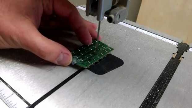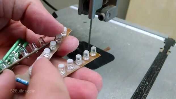 Para hacer una tira larga de esto, corte el extremo del tablero con el interruptor de encendido, primero cortan la junta entre las 4 filas de LEDs. Usé mi sierra de cinta, pero fácilmente puede usar una herramienta dremel (rotatorio) u otra pequeña sierra. Puede dejar el resistor conectado a una de estas tiras. Esto hará más fácil más adelante debido a la resistencia ya se conectará al circuito.