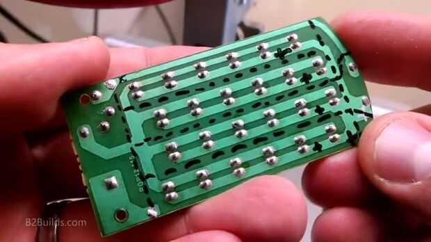 24 LEDs se conectan en paralelo. Es decir, todos los extremos positivos de los LEDs están conectados juntos y todos los extremos negativos de los LEDs están conectados juntos. Que están dispuestos en 4 filas de 6 LED, con los rastros a lo largo de esas 4 filas. También hay una resistencia entre el voltaje de entrada y los LEDs, que camina la tensión hasta el nivel adecuado para los LEDs.