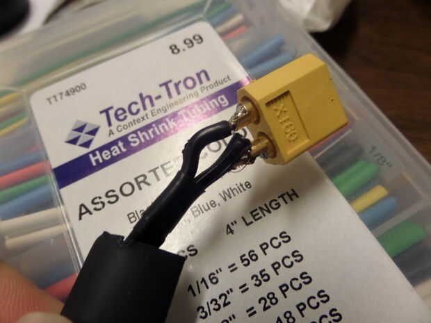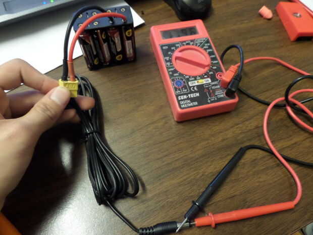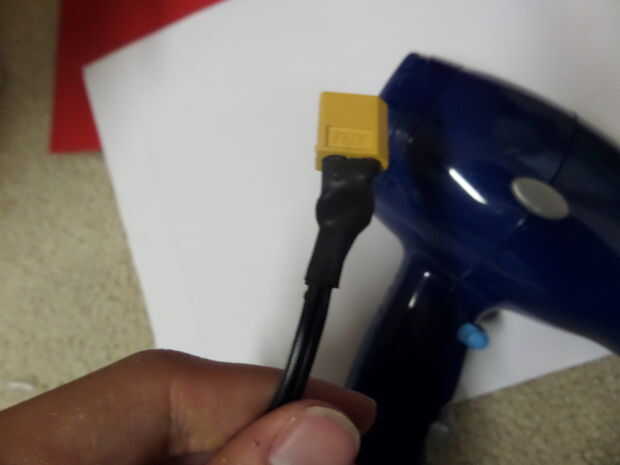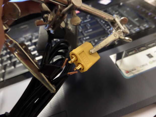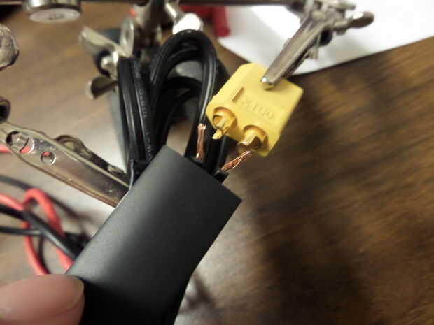 Si el enchufe no está incluido, luego ver si puede salvar cualquier viejo Jack a utilizar. Encontré un viejo conector coaxial para algún dispositivo que tiene mucho que roto y así que, corte los cables pelados y conectado a los conectores XT60 utilizados en RC aviones. Ver fotos arriba para ver cómo lo hice.