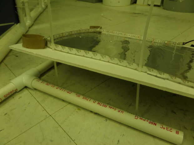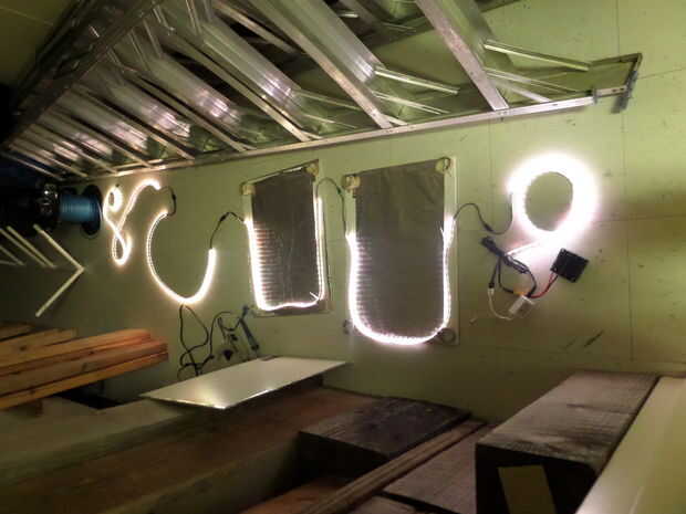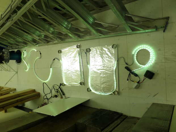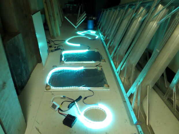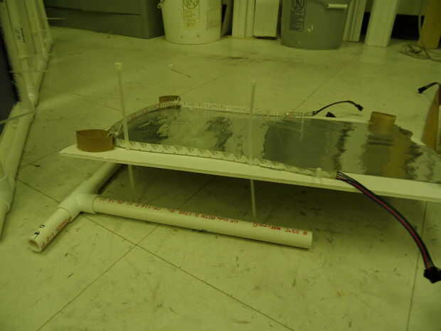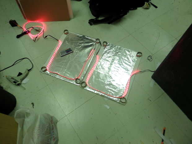 A continuación, tomar cada tira de LED (desconéctelos) y ponerlos en forma de U en cada tablero. Marcar 4 lugares en el tablero que son vitales la decisiones la luz tira curva y perforar pequeños agujeros (a cada lado de donde la tira de LED se colocará) allí a amarra los LEDs en la placa. Asegúrese de que los LEDs se enfrentan a paralelo a la lámina.