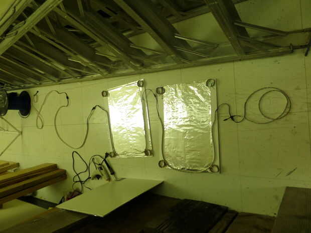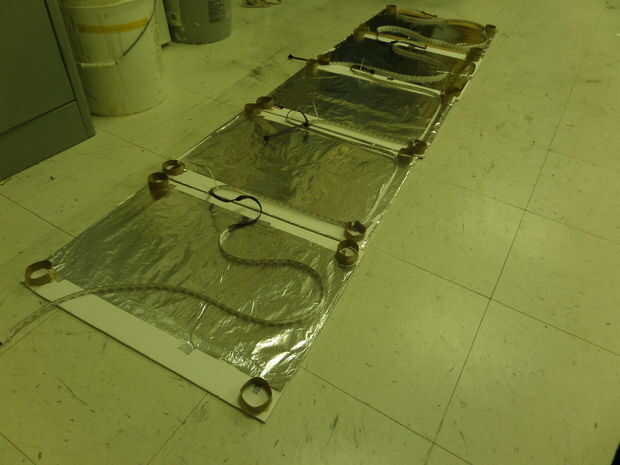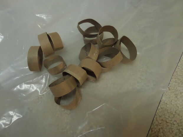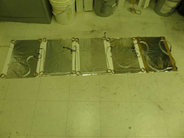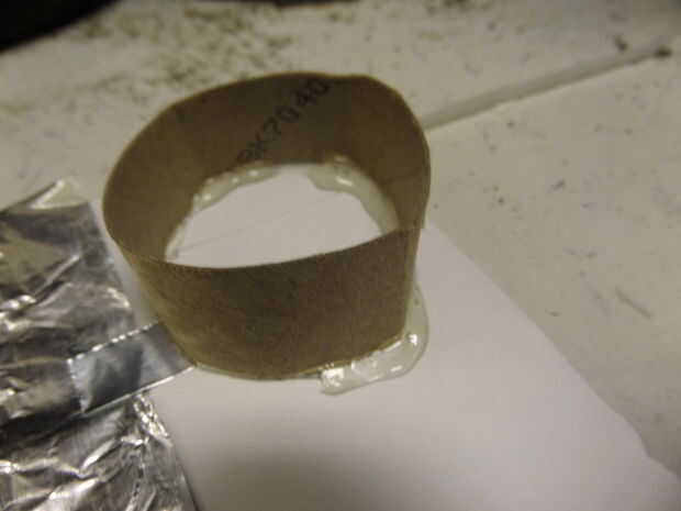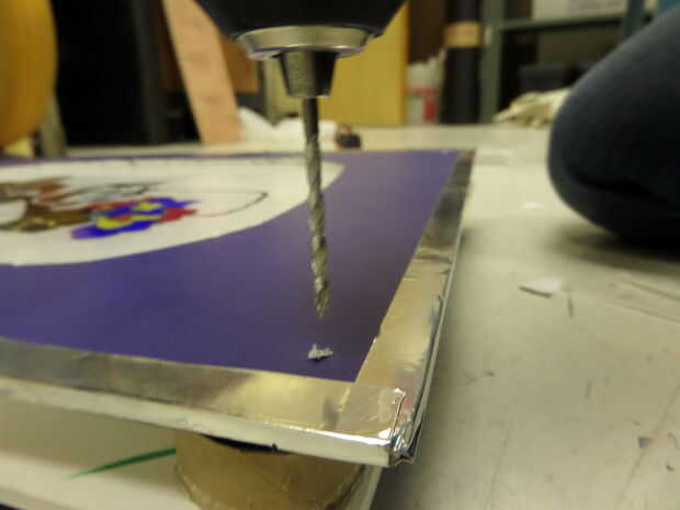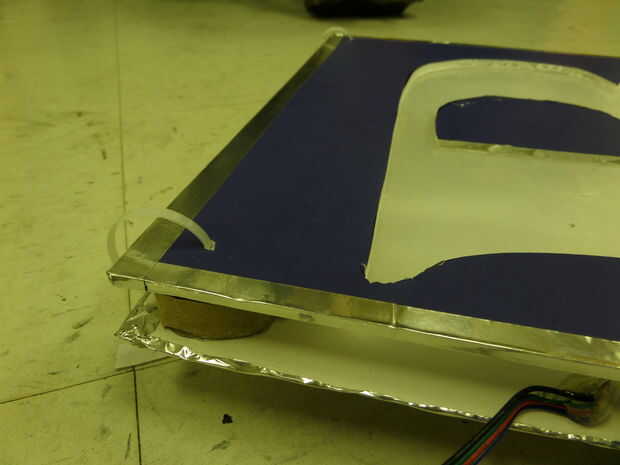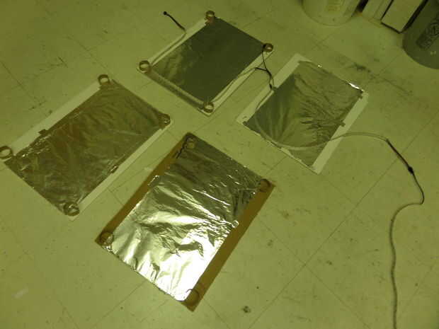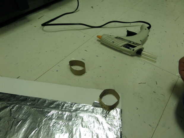 Para empezar, arrancar 5 hojas de papel de aluminio alrededor 18" de longitud. Estos serán grabadas/pegado sobre el tablero. Después de grabar la lámina abajo, tomar los tubos de toalla de papel que han sido talados a 1" y pegamento caliente uno en cada esquina de cada junta. Estos son los espaciadores.