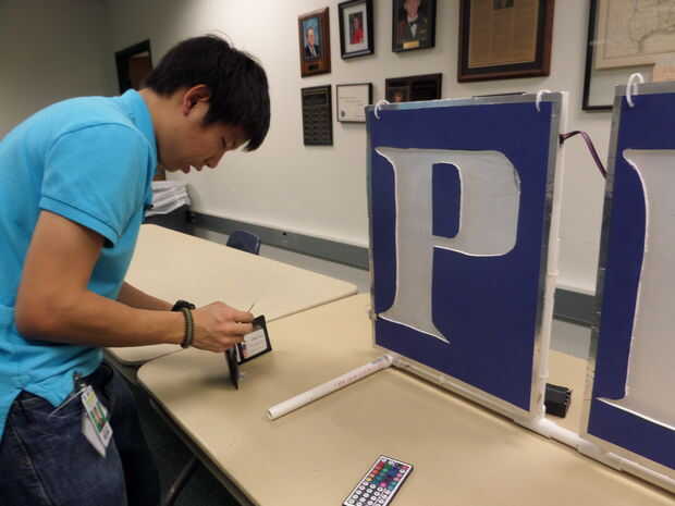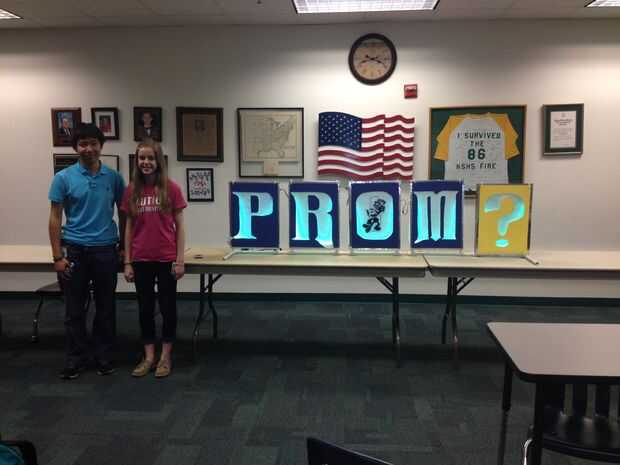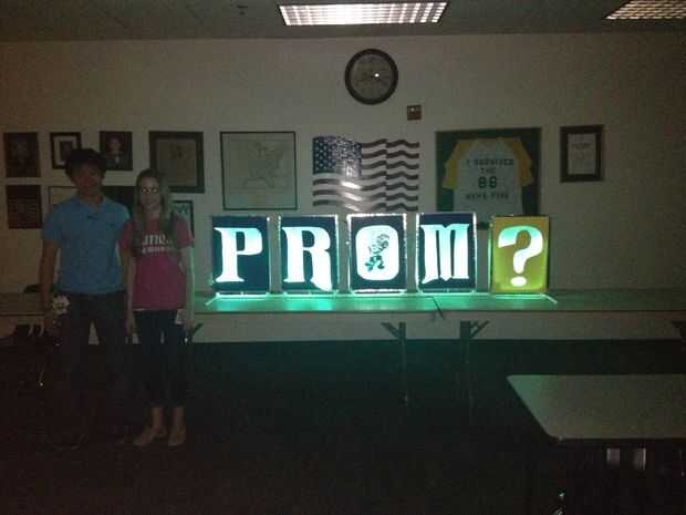 Bueno, y esto es cómo le pregunté: coloqué el cartel en un cuarto oscuro. (La puerta estaba en la parte trasera también). Luego en el frente de la sala, tenía el proyector con el nombre de la niña. Luego coloque una silla en medio de la habitación el cartel de LED y luego apaga las luces y el tablero del LED. Cuando llevó en el cuarto oscuro, naturalmente, ella se concentró en mirar su nombre en la pantalla del proyecto. ¿Entonces le preguntó a sentarse en la silla hacia la parte posterior de la sala, tal como lo hizo, un poco confundido, porque claramente era su nombre con puntos suspensivos en la parte delantera, y mientras que rota para sentarse, que golpee las luces del mando a distancia y hacia fuera hace estallar las palabras PROM?