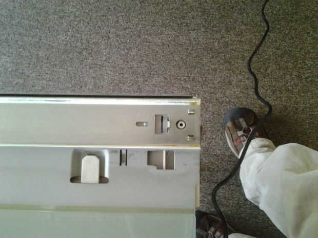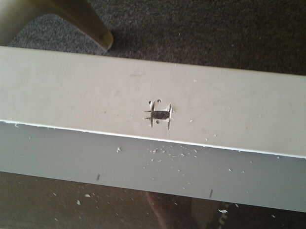 Perforé a través de una de estas lagunas a ambos lados del plástico. Los orificios resultantes se utilizaría más tarde para colgar todo el tablero en la pared con clavos. Ya hackeado también abra un conjunto interruptor de tamaño en el centro del tablero. Sabiendo que un lado del corte terrible contra la pared y al otro lado escondido detrás de metal me dio tranquilidad ya que, como se puede ver en las fotos, estoy no exactamente exacto con mi herramienta rotatoria y mi corte vive hasta el término "hacking".