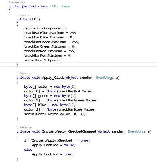 El segundo código a escribir es el código de C# que va a ser una interface graphique puede desplazarse un bar para entrar en el color que desee aplicar. Básicamente tienes que hacer un nuevo proyecto WCF en visual studio. Añadir 3 barra de desplazamiento en la interfaz de un botón de aplicar y finalmente un puerto serie (la puede encontrar en la caja de herramientas a la izquierda). Después de se puede pegar el código en la imagen.