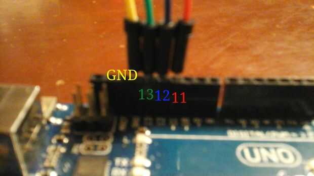Conecte el cable amarillo a tierra, luego verde cable con conector de 13, al pin 12, azul y rojo al pin 11