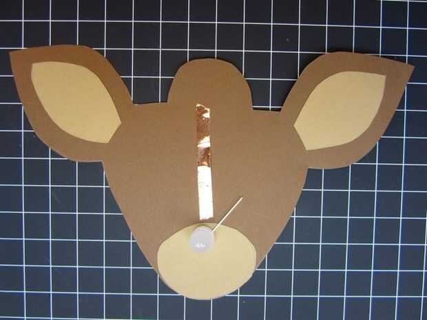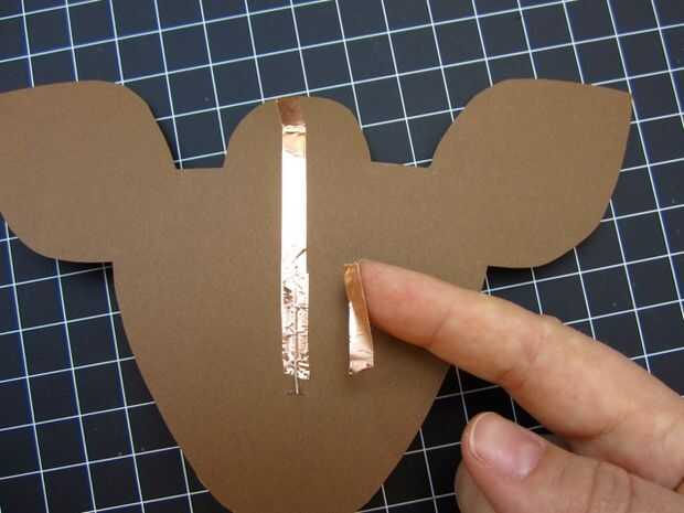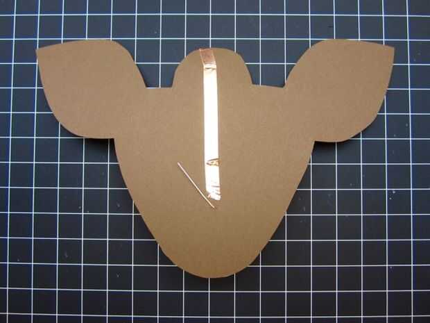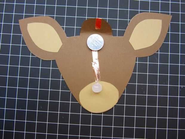 En el frente, ejecutar una tira de cinta conductora directamente hasta el centro de la cabeza del reno hacia la pestaña de la batería. No ponga cinta sobre la ficha.