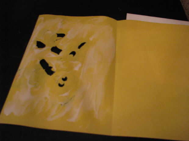 Siguiente. Poner pegamento en la parte posterior de la cartulina. Presione contra el libro blanco de la tarjeta.