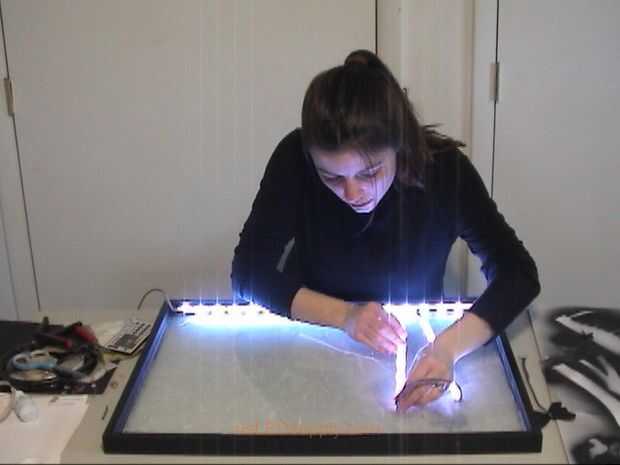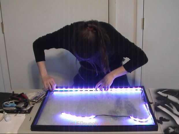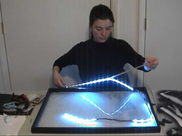 Pele apagado el forro Self-stick del LED flexible tiras y ponerlas en su lugar, presionando hacia abajo a lo largo de la longitud de la tira.  Sostenga la parte posterior del marco para ver si crear el efecto deseado - y recuerda que van a ser aún más brillantes en luz/oscuridad baja!