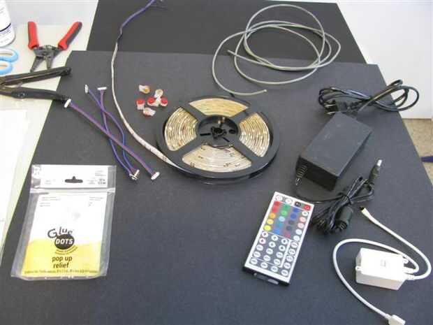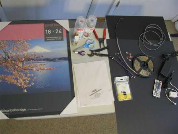 ~ ~ Tira flexible del RGB LED-decidí usar LEDs RGB (cambio de color), sin embargo, si sólo desea un color sólido podría hacerlo también. Cuánto necesita depende el tamaño de fotograma que se seleccione-para este proyecto que utilicé 24" a lo largo de la parte inferior y un pedazo de 12" y 8" detrás de la pareja. Por lo tanto, total, he utilizado 3 pies 8 pulgadas de tira del LED.
