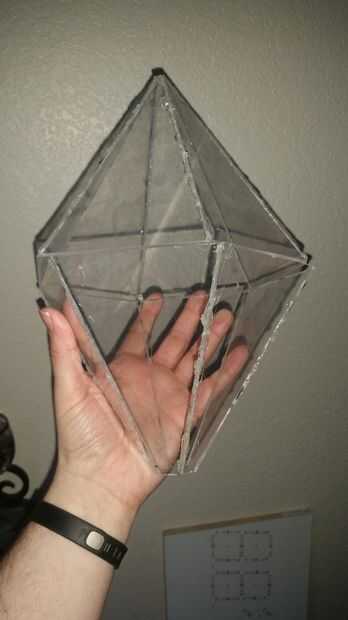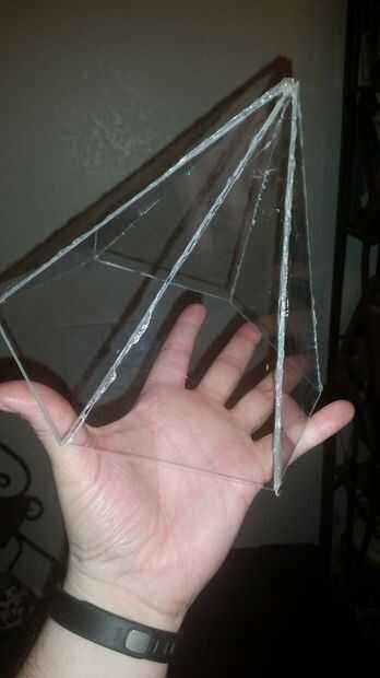 El plumbob exterior fue hecho con pedazos de una hoja de acrílico estándar. Dibujé el diseño de la película protectora de acrílico previamente. Cortar 12 altos triángulos y un hexágono para la cintura. No elimino la película de acrílico hasta que llegó el momento de ensamblar las piezas, pero eso fue porque utilicé la herramienta Dremel. Si utiliza una herramienta de puntuación, separar las piezas de acrílico anotadas será más difícil hasta que quite esa película.