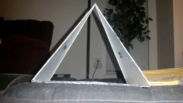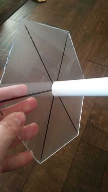 Pone al otro lado del hexágono boca abajo y comience con dos piezas de las piezas restantes del triángulo y colocarlas en la oposición extremos como hizo antes. Todavía se reunirán en el centro, pero también descanse en la tubería. Cortar la punta de cada uno de los triángulos en la parte donde se une el tubo, más o menos una pulgada. Una vez que hayas hecho esto, montar la parte inferior la mitad en una manera similar como hiciste la parte superior de la mitad, a no pegar a la tubería o el hexágono. Una vez que termines, tienes tu parte superior e inferior mitades completadas.