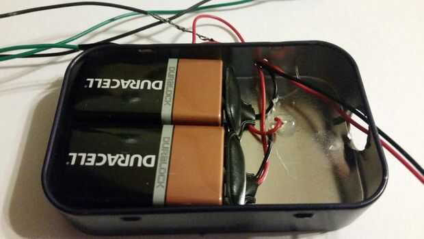Opción 1: Dos baterías de 9v y algo del tamaño de una lata Altoids (sólo hace que usted línea interior a no garantizar contactos metálicos causa un cortocircuito). Ventajas: Todo lo que necesitas son dos pinzas de batería de 9v, probablemente menos costosos. Desventajas: dependiendo de la duración del evento, puede ir a través de un montón de baterías. Dos de ellos último cerca de 6 horas antes de que se demasiado tenues aviso condiciones más brillantes, pero se pueden estirar en condiciones más oscuras.