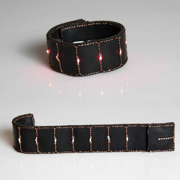 Exploramos con material conductor y LEDS, láser de corte de trabajo del cuero, a mano coser con hilo conductor y haciendo postes translúcidos. Aunque utilizamos impresoras 3D tenemos acceso a las cortadoras láser, usted podría hacer este accesorio en su casa sin esas herramientas (le diremos cómo en ese paso).