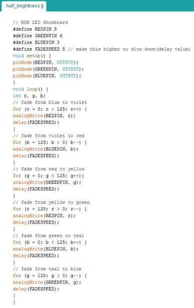 Este bosquejo es relativamente simple. Éste se establece que los LEDs en medio brillo que parecía ser más que suficiente. Después de todo, esto está diseñado para ser utilizado en la noche pero la luz aún se puede ver durante el día. Este código muestra cómo la luz cambia de color. Esto se puede ajustar. Usted puede cambiar la secuencia de color, la velocidad, el brillo, eliminar ciertos colores, como quiera que se muestre. Prácticamente cualquier color se puede hacer con una tira RGB, al igual que la pantalla en su teléfono o tv.