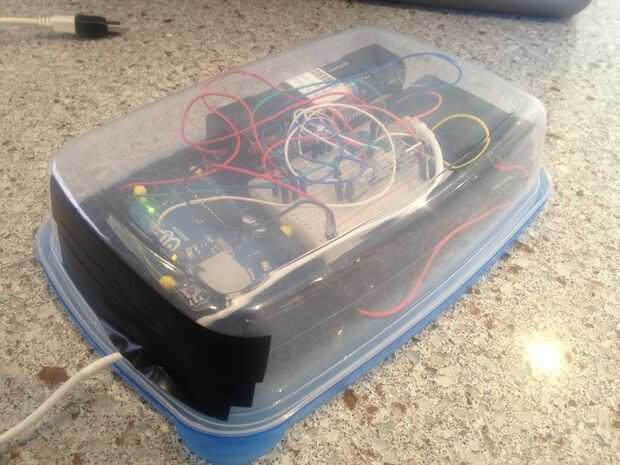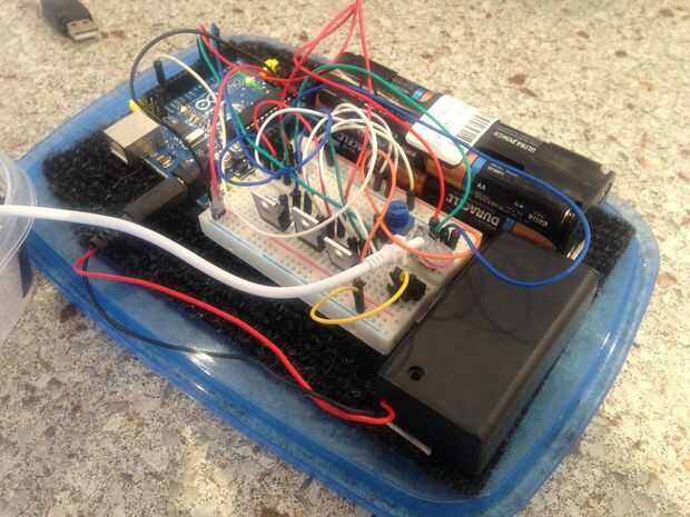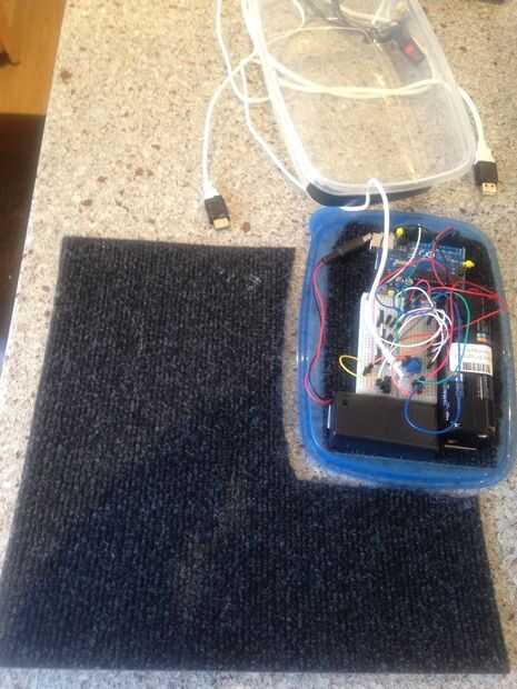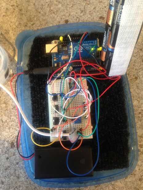 Utiliza un recipiente de plástico para contener todo el electonics para proporcionar algún grado de impermeabilización de la nieve. Para montar todo dentro el contenedor me había pegado un pedazo de una almohadilla de alfombra fina cortada y utiliza tiras de velcro para sujetar cada componente. Sentí que esto era conveniente porque podía mover todo tantas veces como sea necesario. En estas imágenes se puede ver el poder de Arduino fuente, es sólo una batería de 9V en la caja negra.