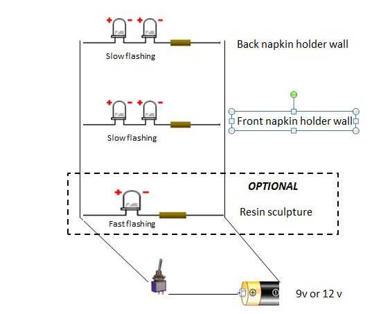 Opcionalmente, adicional LED y un resistor se agregaron a las esculturas de resina (consulte la parte opcional del diagrama). Si 2 LEDS fueron utilizados en la escultura de la resina, fueron conectados en serie y la resistencia fue agregada en lo negativo. Luego estos fueron conectados en paralelo a las 2 paredes.