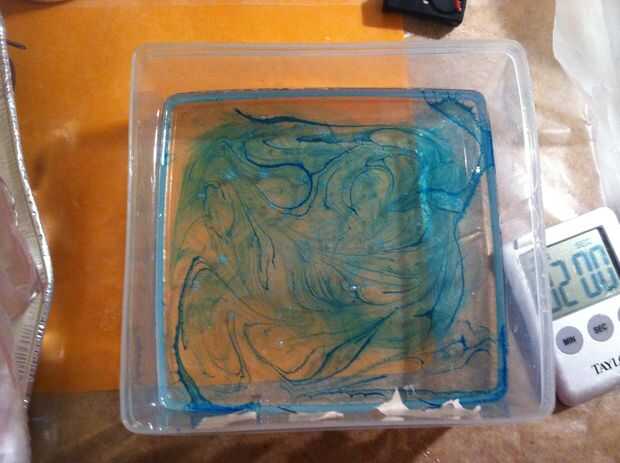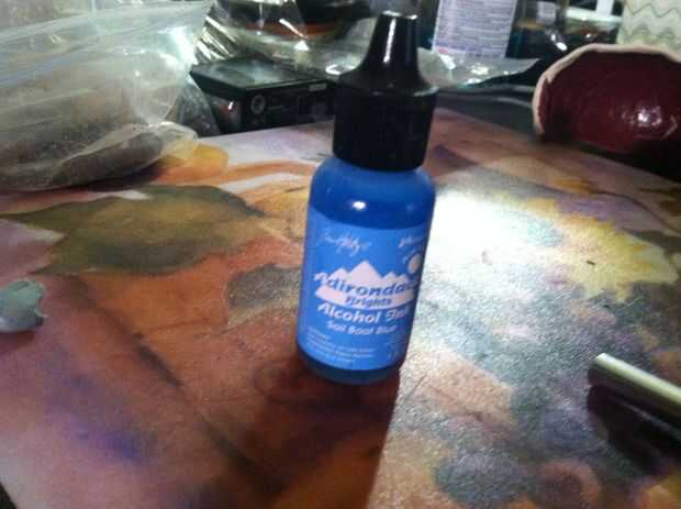 En el sostenedor de la servilleta de cascada, añadí algunas gotas de tinta de alcohol en varios puntos y remolina con un palillo de dientes (ver imagen de remolinos azules en molde)