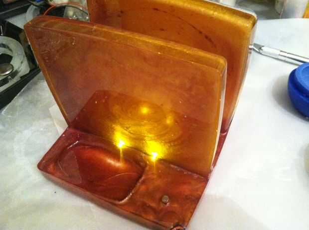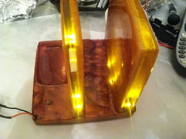 Para las paredes, derramé una capa de color y allowedit para curar antes de agregar los LEDs. Después de la capa de color cura, me vertió una clara capa de resina sobre la resina coloreada e insertar los LEDs en el molde.