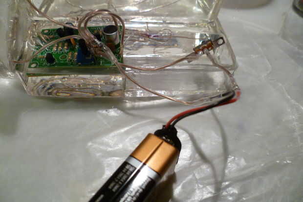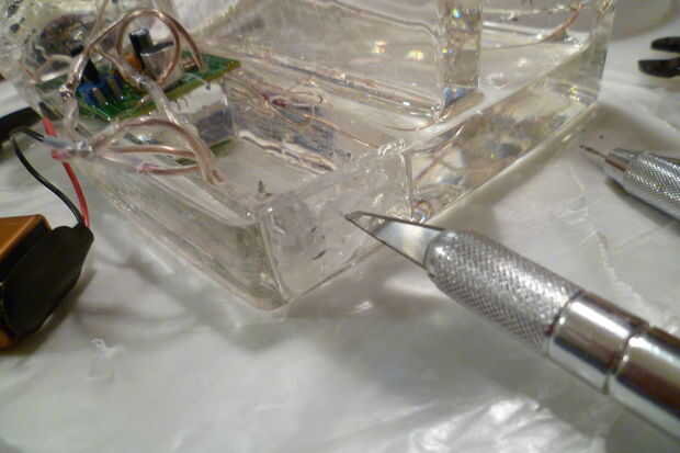 Coloque la placa de circuito montada en el molde base y vierta cuidadosamente una fina capa de resina. Tenga cuidado de no conseguir la resina encima del micrófono o el potenciómetro. Por desgracia, resina filtra en el bote y así ya no soy capaz de ajustar la sensibilidad. Derramé suficiente resina para mantener la Junta en su lugar. Deje transcurrir 24 horas curar.