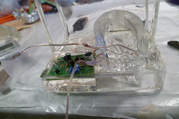Si usted coloca opcional LED en la escultura de resina de cubierta de la batería, luego lo alambre ahora. Consulte el diagrama. Conecte el interruptor y los cables de la batería. Antes de soldar todo, conectar una batería de 9 voltios y asegúrese de que los interruptores y luces todo funciona.