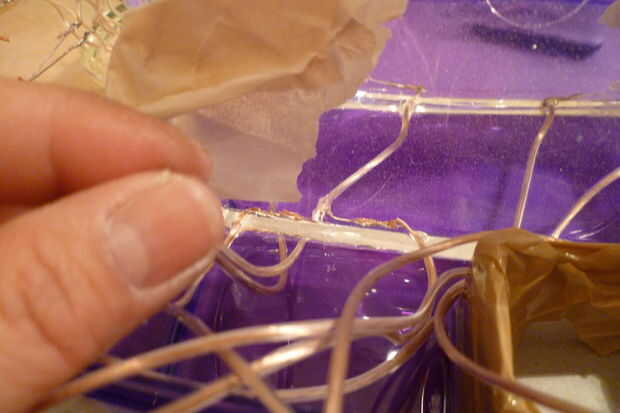 La Junta armada va a quedar en la superficie de la resina y no ser totalmente cubierta. Para descansar la placa de circuito para que no se sienta demasiado lejos en la resina, fijar las paredes en el molde ya que se encuentra más profundo en la resina. Coloque las paredes en el molde base y ejecutar los 4 cables de los LEDs en la pared debajo de las paredes frontales. Para que se no ser sumergido todavía en la resina que se verterá con cinta adhesiva los extremos de todas 8 alambres por encima de la resina.