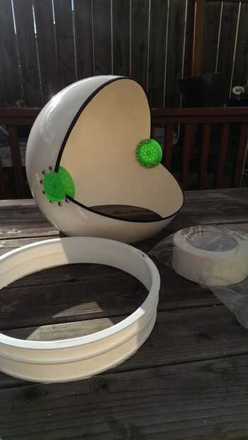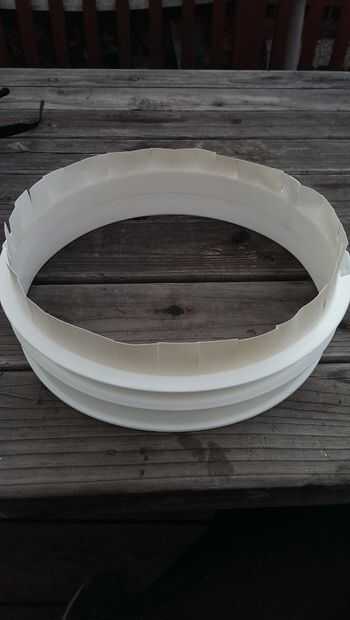 El collar de casco del espacio es realmente el borde superior de un cubo de 5 galones. Retire la manija del cubo del metal. Usando un cortador de lámina o cuadro Exacto (¡ con cuidado!) corte todo el cubo entero tan cerca del borde como sea posible. Ahora tienes ambas el collar para el casco y un práctico recipiente para guardar piezas pequeñas.