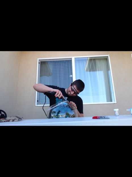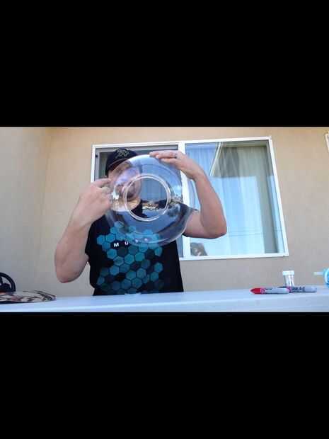 Usando una pieza redonda de cartón con un diámetro de 9", insértelo en el conjunto en la base del casco. Ajustar lo mejor posible a la parte inferior del casco. Utilizando un rotulador la cartulina en el globo del esquema y quite el cartón. Esto se convertirá en el agujero para la cabeza caber en. Utilizar un Dremel 540 * pieza para hacer el corte y use gafas protectoras. Mantenga el corte trozo del globo, este se utilizará más adelante. Utilice el Dremel * 407 piezas y papel de lija para alisar hacia fuera el agujero.