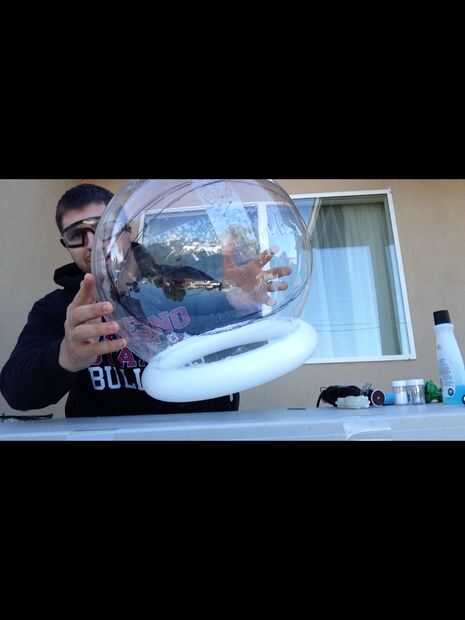 Para esbozar la mascarilla casco espacio hice tan simétrica como sea posible utilizando una regla y cinta. Puede crear este esquema sin embargo que desee con un rotulador. Usando el Dremel 540 cortar el contorno, ser prudentes y no se aplican a mucha presión al globo cuando se corta. Suavizar el contorno usando papel de lija y la pieza de Dremel 407. Deseche el corte hacia fuera plástico.