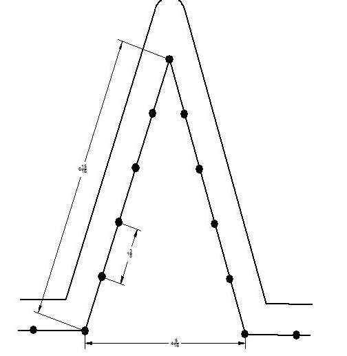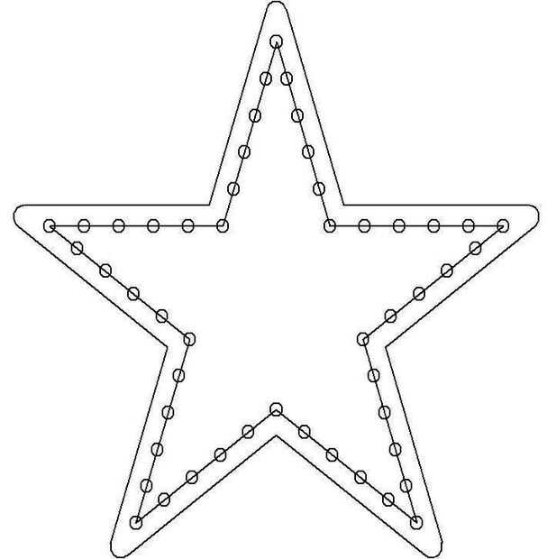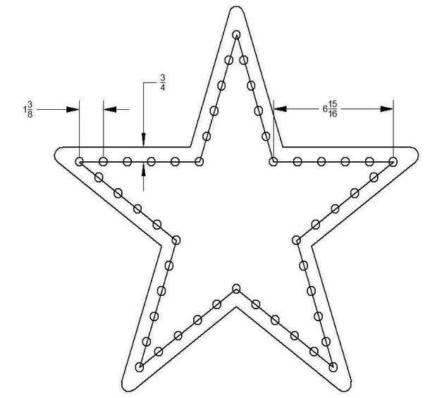 El centro de los agujeros a lo largo de una línea 3/4" en desde el exterior y son espaciadas 1 3/8" aparte. Esto da un total de 50. Conveniente porque las cuerdas de píxeles disponibles precableado en cadenas de 50. Diseño de los agujeros y luego use un punzón fino para empujar un pequeño orificio en el tablero (una vez más, esto se hace desde la parte posterior. Ahora, taladre un orificio guía de 3/16" o algo así a través de todo el camino. Entonces, desde el frente, perforar otra vez con un 7/16" bits. Hacerlo con cuidado no quiere romper la lámina. Llaman a las especificaciones de los leds para un agujero de 12mm (1/2") pero debido a que el cartón pluma es suave, un agujero más pequeño tiende a mantenerlos más. Porque es un tipo de plástico, la espuma, la perforación tiende a calentar el material. El resultado es algo de fusión. También estamos tratando con el papel y el pegamento que mantiene a por lo que al final no tendrás un agujero limpio agradable. Usé el cuchillo de la maquinilla de afeitar para limpiar un poco y bajar los bits sueltos más grandes pero por el momento que lo ha hecho, usted realmente no nota los bordes ásperos. Estaba pensando en abastecimiento a algún tipo de golpe, pero en aras del tiempo y presupuesto, fui con el taladro. Podrá diseñar los agujeros con las medidas proporcionadas o si obtener una copia de Deltacad y descarga los archivos cad, a incluir un plano de tamaño completo de un punto de la estrella. Esto se puede establecer en el plano y utilizado como plantilla para perforar a través de la ubicación del agujero.