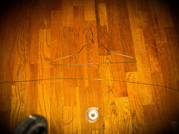 Entonces tomé una percha y enderezó. Miraba ansiosamente mi cinta métrica, todo encrespado para arriba en el piso. Deseo de ser útil.